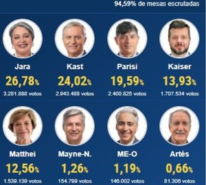 Por su parte, el comando de Jeannette Jara inicialmente se contagió del optimismo generado por las proyecciones televisivas que la situaban por sobre el 30%. Declaraciones previas de Marco Barraza, integrante de su equipo, reflejaban esta expectativa: «Yo creo que va a tener una brecha importante respecto del resultado con la derecha. Eso le va a sacar harto trecho al candidato de extrema derecha que pase a segunda vuelta». Sin embargo, el dato concreto demostró una realidad menos alentadora para el oficialismo. Con una performance similar a la de Gabriel Boric en la primera vuelta de 2021, Jara se posiciona como la segunda ganadora oficialista con el porcentaje más bajo desde el retorno a la democracia, solo por encima de Alejandro Guillier, quien obtuvo un 22,70% en noviembre de 2017.